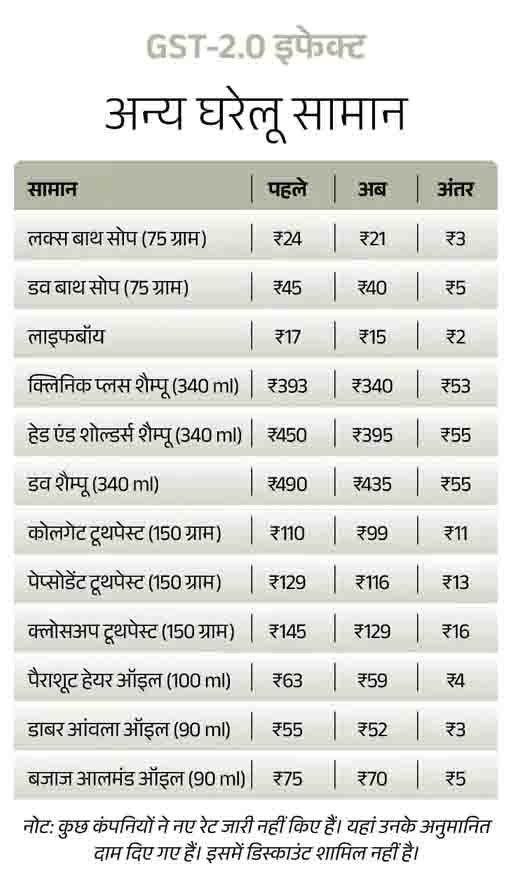 ग्राफिक्स में देखें रोजाना इस्तेमाल का कौनसा सामान कितना सस्ता हुआ। कुछ कंपनियों ने नए रेट जारी नहीं किए हैं। इसलिए उनकी अनुमानित MRP दी गई हैं।