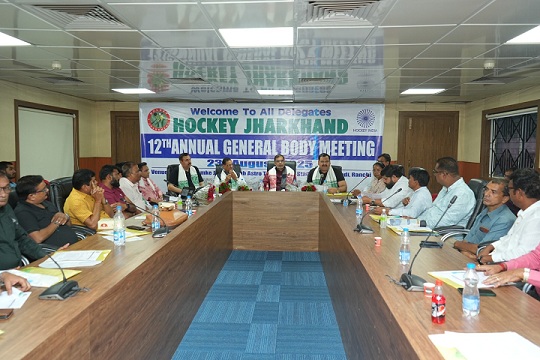 रांची, 23 अगस्त — हॉकी झारखंड की 12वीं वार्षिक आम सभा का आयोजन रांची के मरांग गोमके जयपाल सिंह मुंडा अंतर्राष्ट्रीय हॉकी स्टेडियम, मोराबादी में संपन्न हुआ। इस सभा की अध्यक्षता हॉकी झारखंड के अध्यक्ष एवं हॉकी इंडिया के महासचिव श्री भोलानाथ सिंह ने की। इस अवसर पर झारखंड के सभी जिलों के हॉकी संघों के अध्यक्ष, सचिव, कार्यकारिणी सदस्य और अन्य गणमान्य अतिथि उपस्थित रहे।