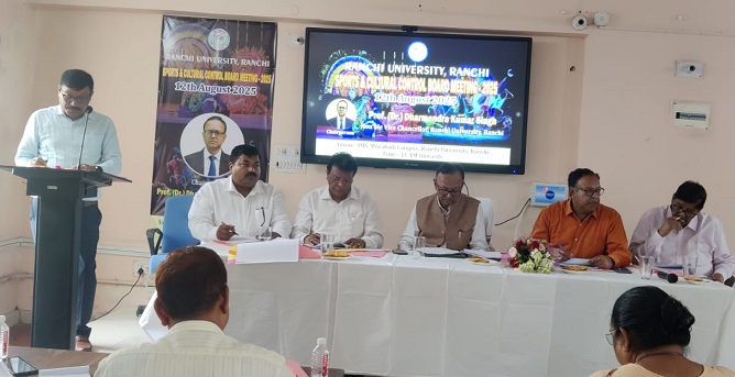 रांची, 12 अगस्त 2025। रांची विश्वविद्यालय के कुलपति प्रो. (डॉ.) धर्मेंद्र कुमार सिंह की अध्यक्षता में मंगलवार को विश्वविद्यालय के आइएमएस सभागार में स्पोर्ट्स एंड कल्चरल कंट्रोल बोर्ड की बैठक आयोजित हुई। बैठक में खेल बजट, सत्र 2025-26 के खेल आयोजन और ट्रायल कैलेंडर पर चर्चा की गई।