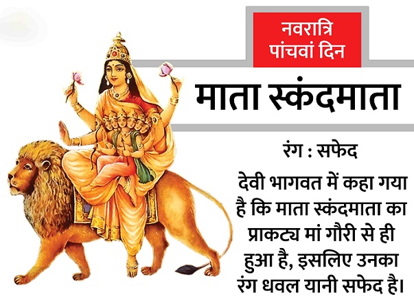 पुराणों के अनुसार, भगवान स्कंद (कार्तिकेय) की माता होने से मां भगवती के इस रूप को स्कंदमाता नाम दिया गया है. कमल के आसन पर विराजमान पद्मासना देवी मां स्कंदमाता की चार भुजाएं हैं और मां अभय मुद्रा में हैं. माता की गोद में छह मुख वाले बाल स्कंद को माता ने धारण किया है. कमल पुष्प लिए माता अति शांत, पवित्र और सकारात्मकता का संचार करने वाली हैं. ममतामयी माता अपने भक्तों को आशीर्वाद देती हैं और उन पर कृपा होती है.